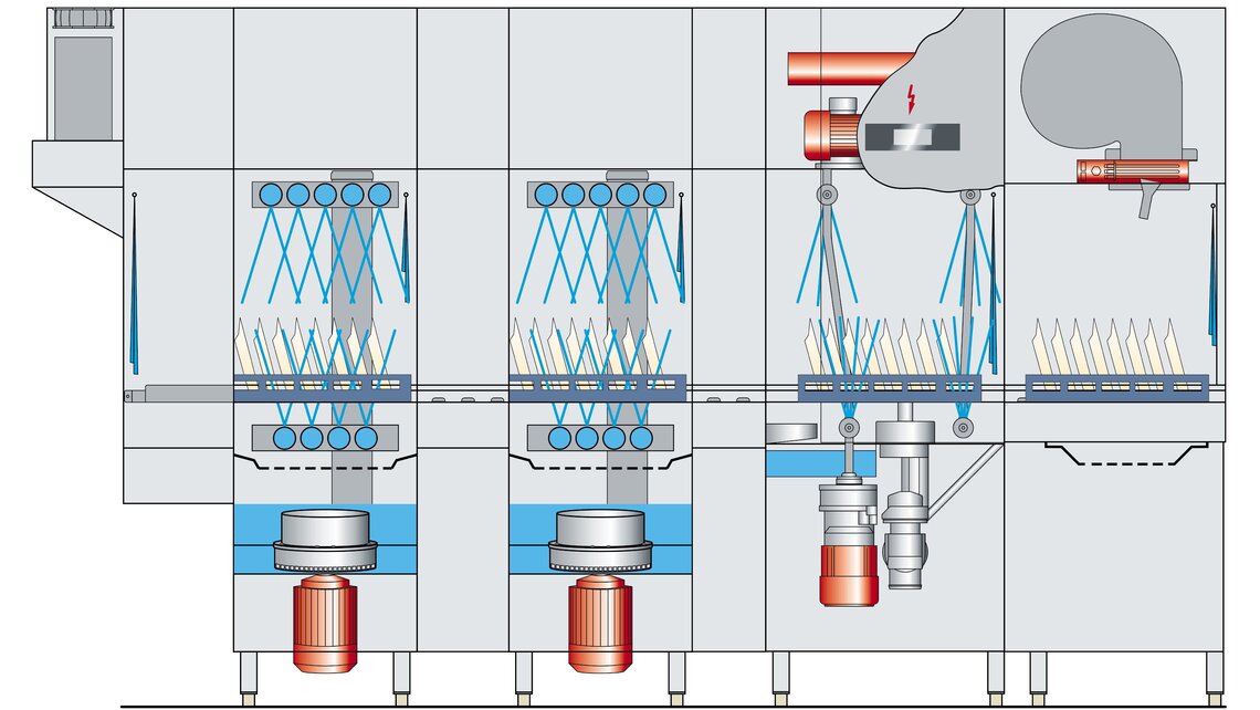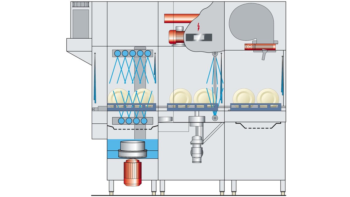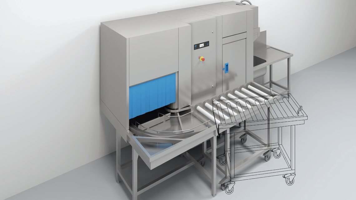 so if it works on aeroplanes, it will work on the MEIKO UPster K! Our engineers were hunting for the right sealant while developing this rack type dishwashing machine, you see, one of the UPster K's advantages is its modular construction, which provides greater scope and flexibility in its manufacture. Whether you need a simple dishwashing machine with straight roller conveyor tables using curves with motorised rollers or a carefully and cleverly designed dishwashing hub, there is scope to design your machine to fit your space. Modules are simply connected to other modules.