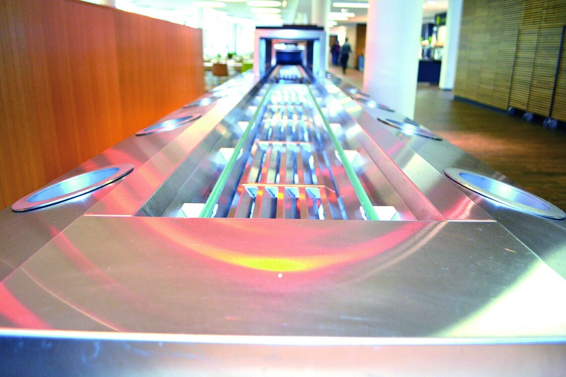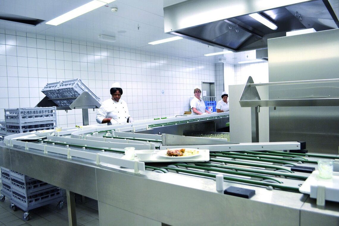 三条餐具回收带在用餐时间内高速运转。输送技术成熟,基于水平和垂直的输送路线,直接通向洗碗间。