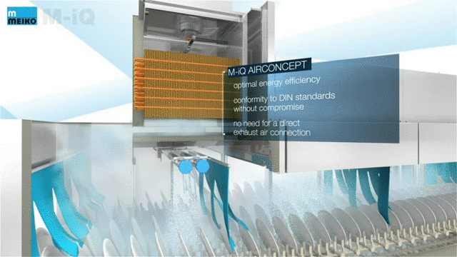 MEIKO 的 AirConcept 空气管理方法,可从排出的气体中回收热能,将空气质量提升至顶尖水平。先前恐怕不受控制地释放到工作环境中的热蒸汽会被循环利用产生热能。当它通过热回收模块时,洗碗机的能耗显著降低。