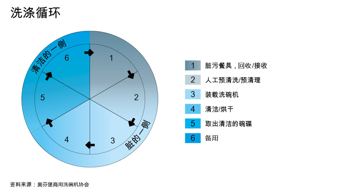 餐具在清洗流程中要历经从清洗至可再用的一个周期。操作人员必须确保在此周期内餐具不会再次受到污染。