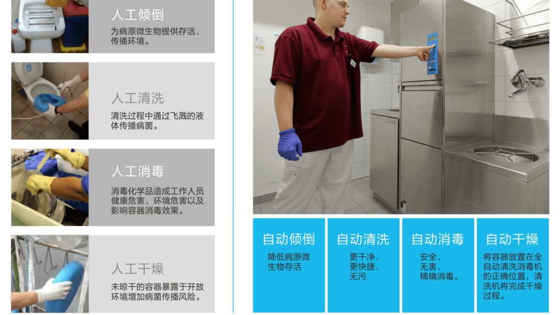 在医院、养老院、护理中心等易感或特殊人群聚集的场所,病区清洗消毒是预防交叉感染的关键环节。尤其是便盆、尿壶等可能接触高致病性或传染性病菌的护理用具,其实是预防交叉感染链条中最重要的环节。目前,很多医院或护理机构,仍然采用人工清洗的方式处理便盆尿壶,清洗后表面看起来一尘不染,但它们是否真的达到院内感控的要求?是否会对患者或工作人员构成威胁?